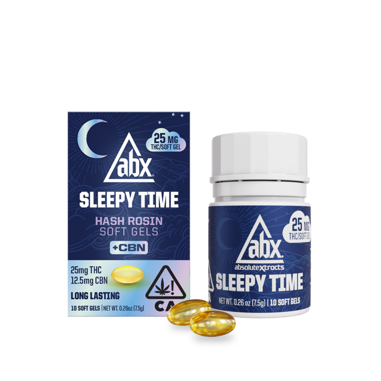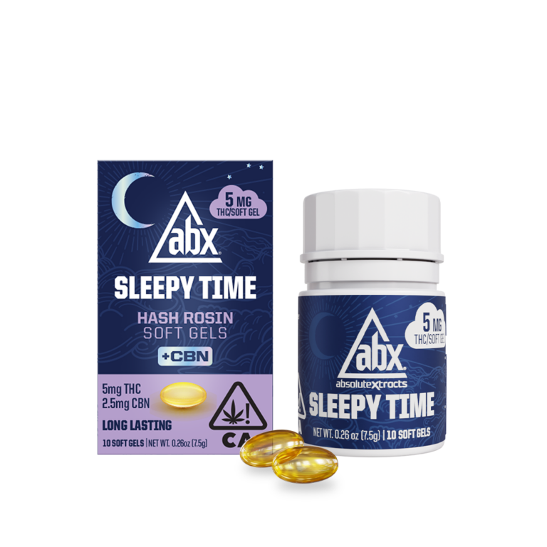 ABX Sleepy Time is a full-spectrum line formulated to support restful sleep. Each soft gel contains 5mg THC and 2.5mg CBN, with long-lasting effects designed to help you relax, unwind, and stay asleep through the night.