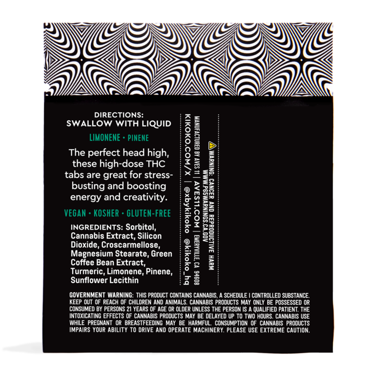 Terps is the word, with aromatic pinene (akin to the gin-like juniper berry) plus a swell of bright, citrusy and stimulating limonene, an anti-inflammatory wunderkind that helps to suppress anxiety and stress. Antioxidant powerhouse, green coffee bean extract, provides a healthful, uplifting boost. For eXperts only, these potent high-dose Sativa XTabs have 50mg of THC per swallowable tablet.